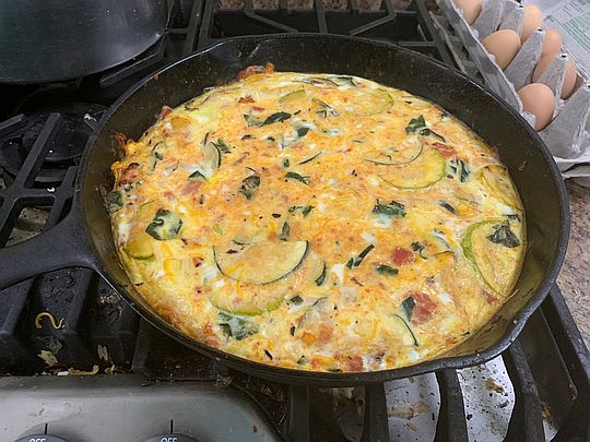 Squash and zucchini frittata still in the skillet