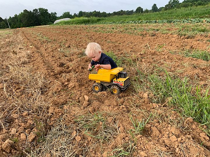 Cooper with the Tonka truck in the dirt