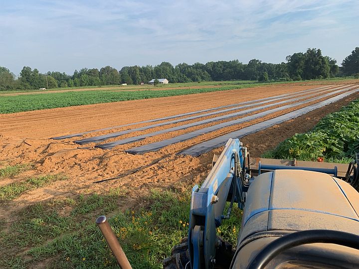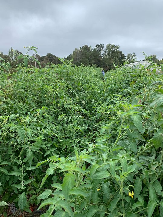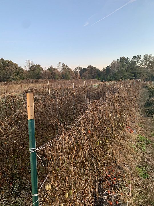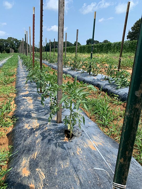 Fall tomatoes with trellis tring on black bioplastic mulch