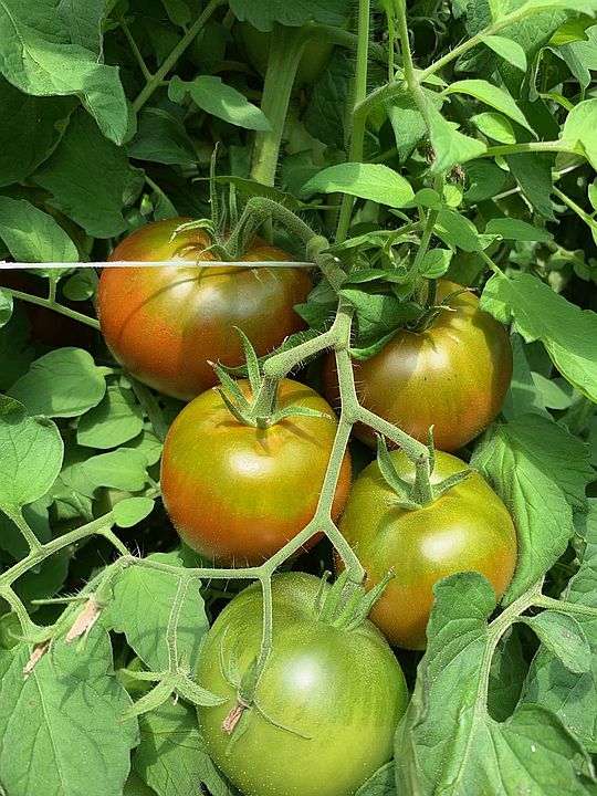 Several tomato varieties we grow start from 12 Striped German, Black Krim, Golden Jubilee, Chocolate Cherry, Pork Chop and center is Black Prince