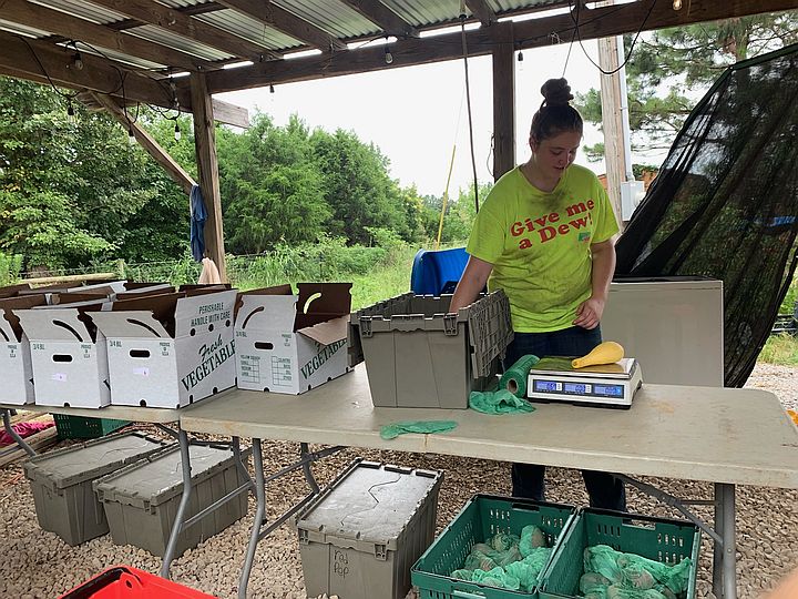 New worker Olivia packing CSA boxes