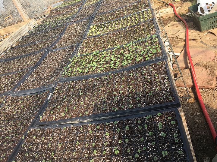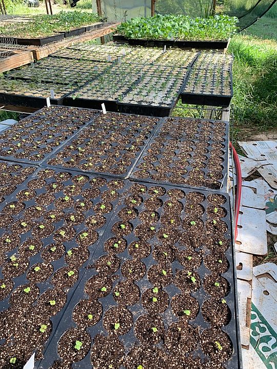 Fall veggies are well underway. this is a picture of several seed trays in our greenhouse