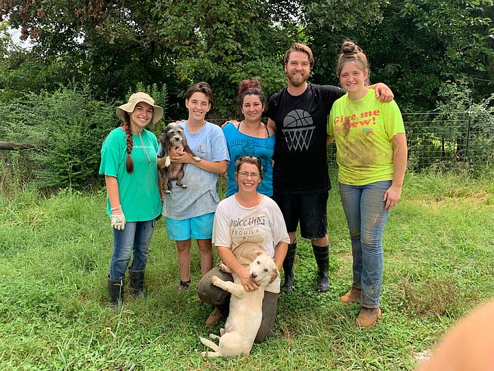Picture of our 2019 work crew L to R Anna, Georgia (dog), Vick, Candice, Patrick, Olivia, and kneeling in front Josephine with Frank (dog)