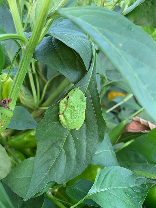 A little green tree frog on a pepper plant