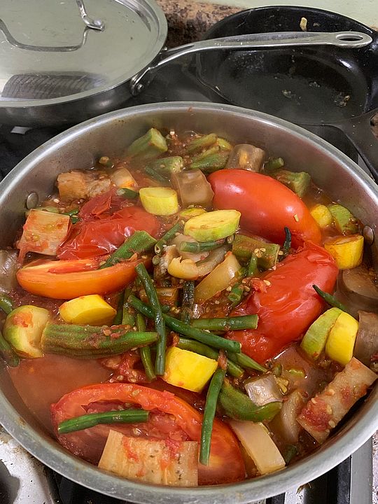 Stewed tomatoes with okra, squash, eggplant, long beans and onions our summer farm dinner