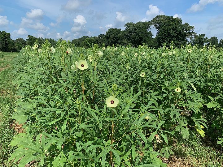Looking down onto our okra patch, lots of blooms