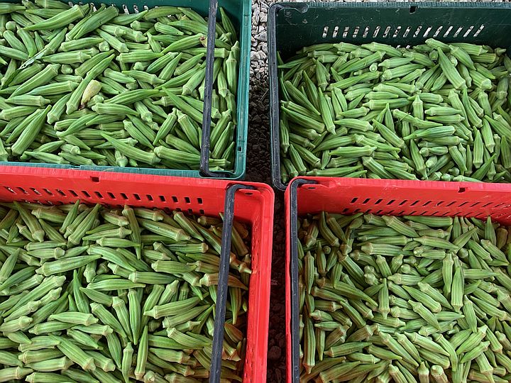 Okra,lots of okra,looking down into four crates of fresh harvested okra