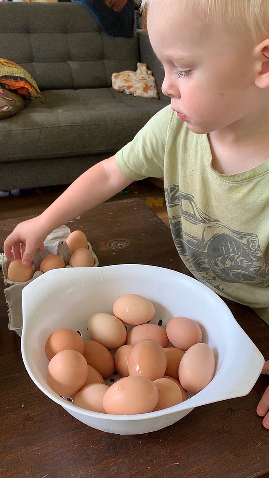 Cooper putting eggs into an egg carton