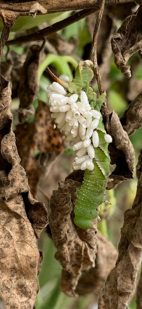 Parasitic wasp eggs and larva on a tobacco horn worm