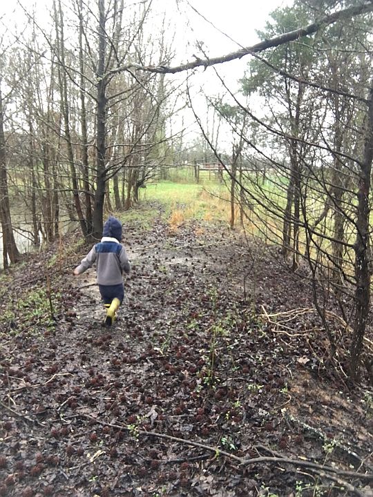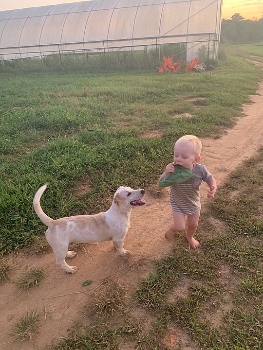 Cooper running down the creek bed. This creek empties into Tubby Bottoms so we named it Tubby Creek, hence our farm name.