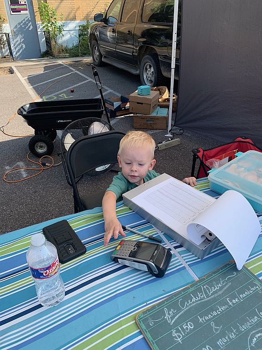 Cooper working the info booth at the market