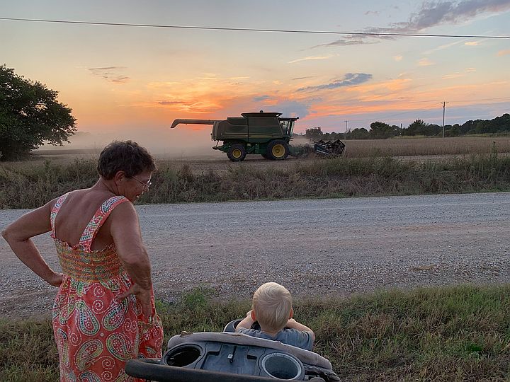 Grammy G and Cooper watching soy bean harvest at sunset