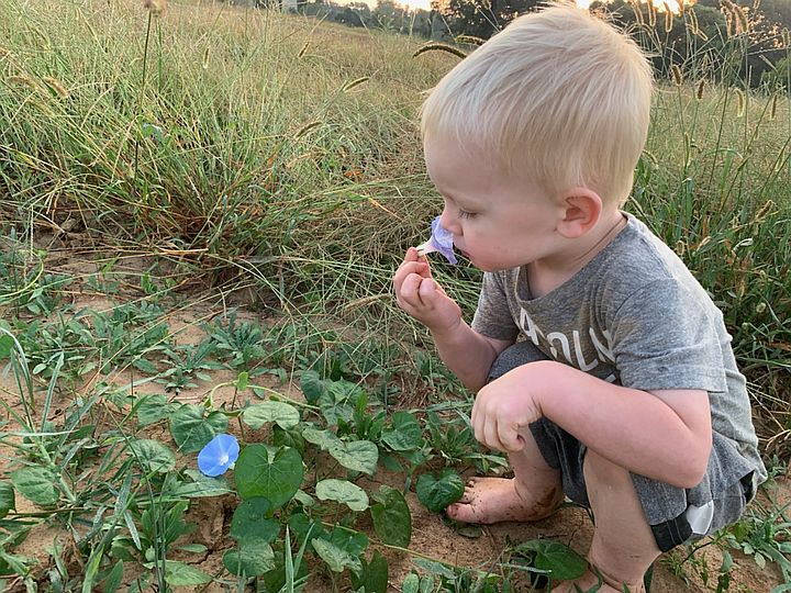Cooper smelling morning glory flower