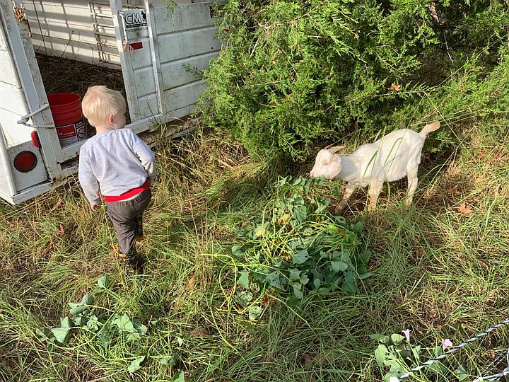 Cooper helping feed sweet potato greens to a goat