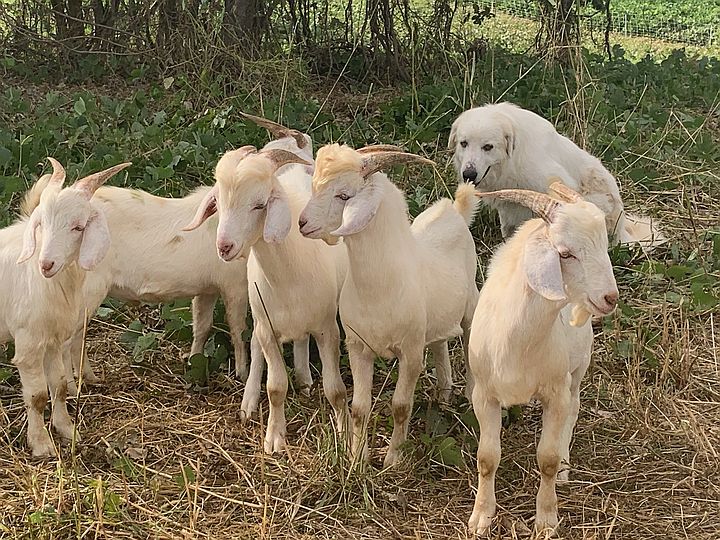 Maggie our livestock guardian dog hanging out with the does and kids during after cud nap time