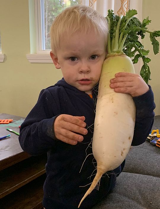 That is one big daikon Cooper is holding