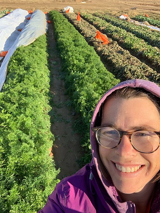Farmer Josephine and her carrots. A picture of Jo with beds of just uncovered carrot beds