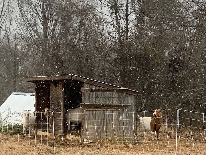 Goats hanging around the shelter during snowfall