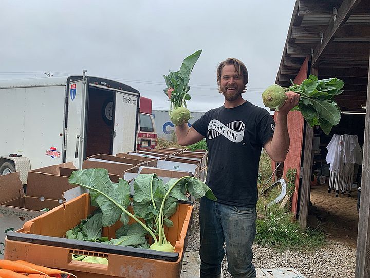 Patrick holding up some big kohlrabi