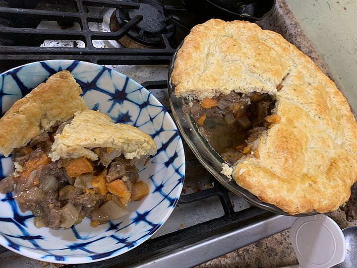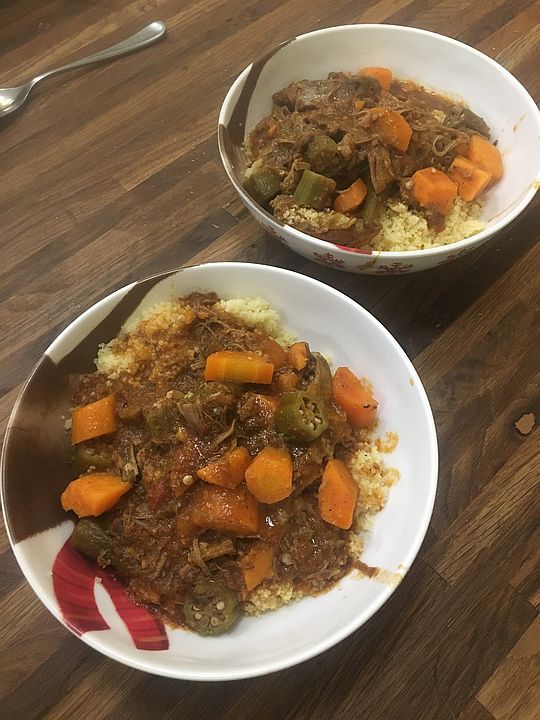 Amazing stew with sweet potato, okra (saved from summer) and goat on a bd of