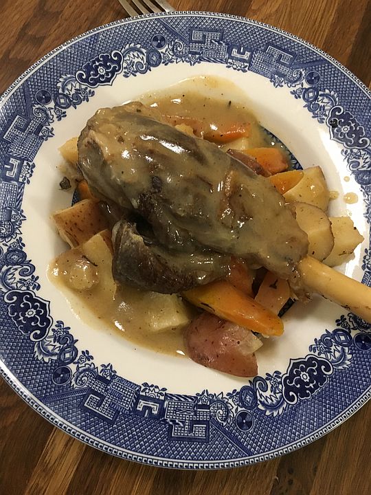 Braised Goat Shank on potatoes and carrots covered in gravey