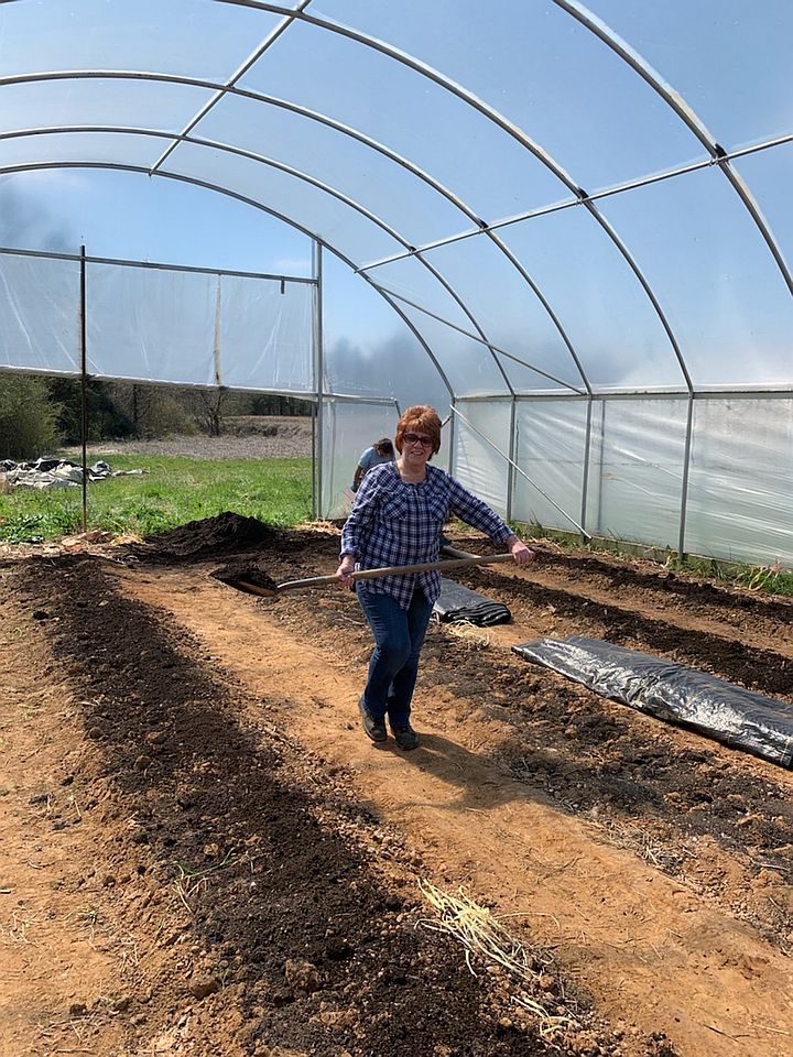 Connie (Randy’s mom) working and moving compost in the high tunnel
