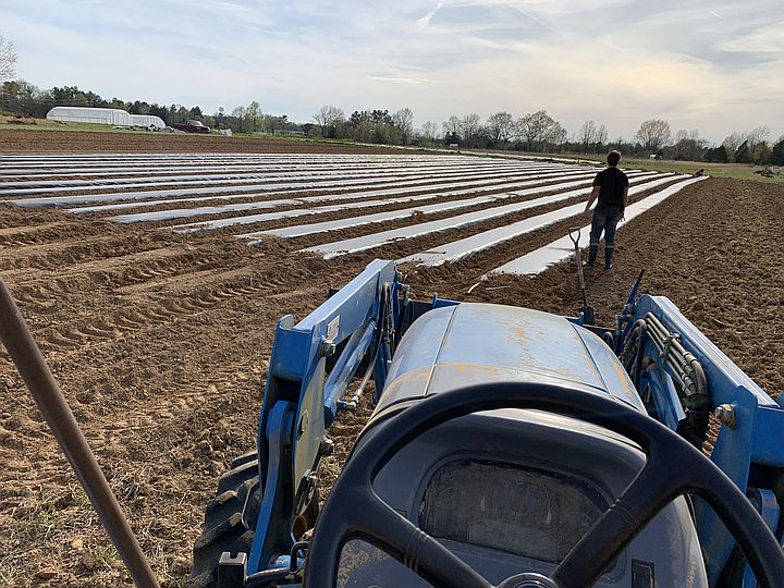 View from the tractor of Patrick standing in front of 17 beds formed and wrapped