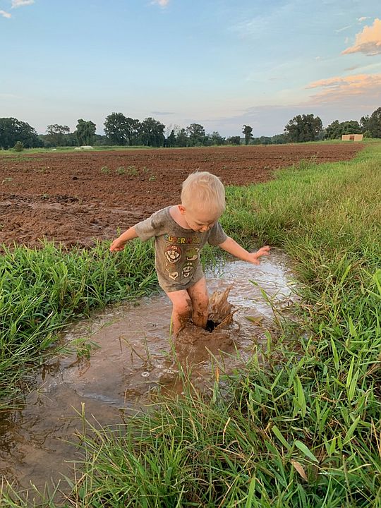 Cooper splashing ina puddle along the field