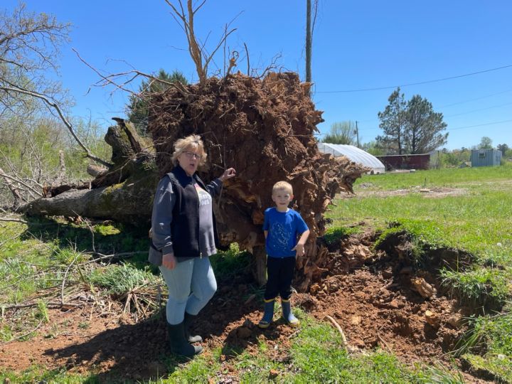 That last storm knocked down a few old trees. Here is Connie, Randy’s mom (L) and Cooper (R) standing by the rootball of one tree