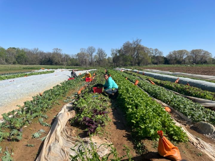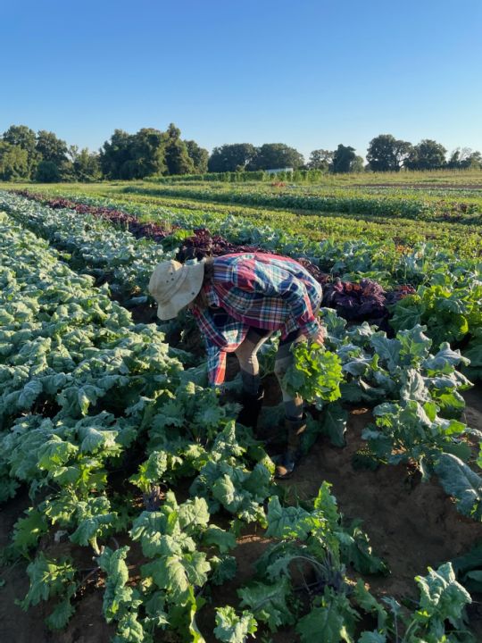 The harvest crew Melea (L), Skylar (M) and Josephine (R) harvesting the greens