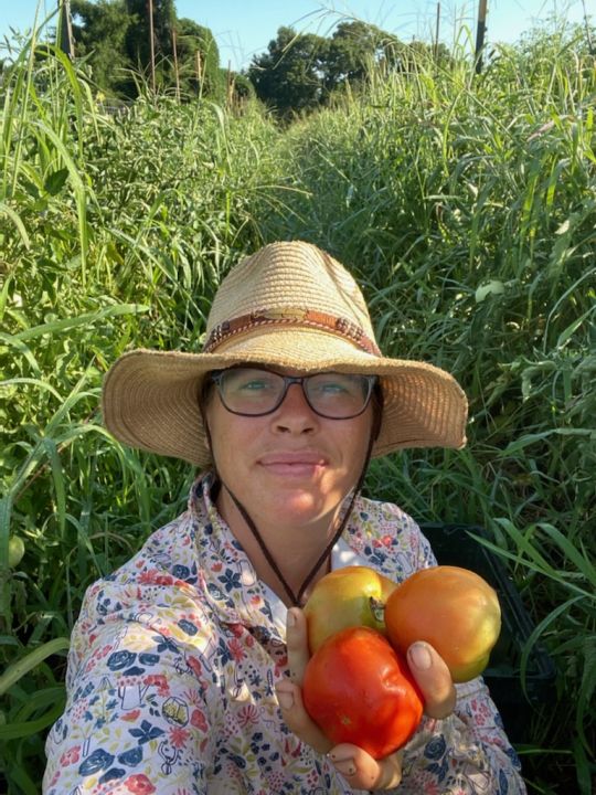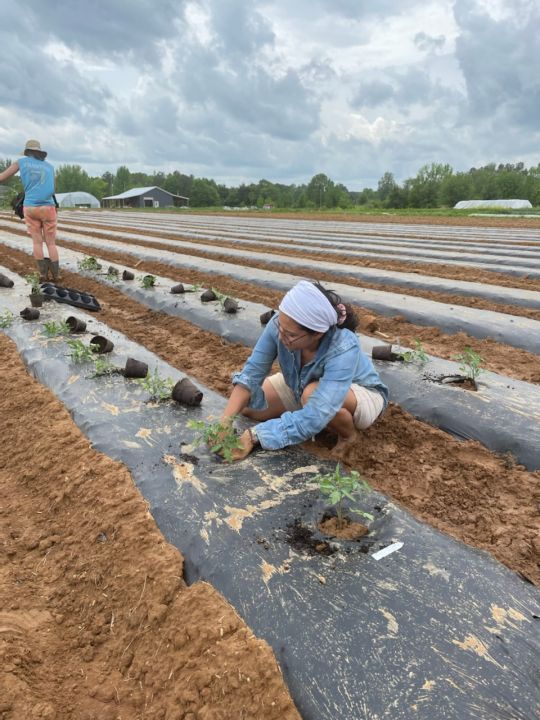 our newest team member, Maria planting tomatoes