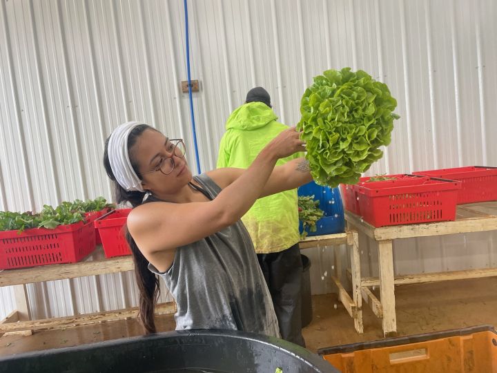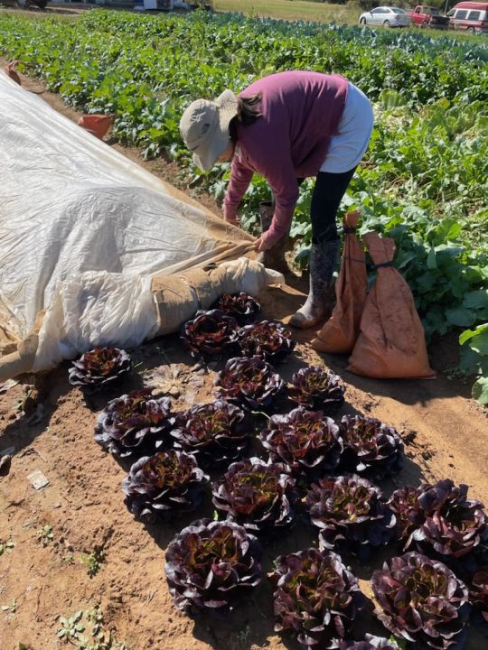 great big heads or kiribati lettuce are coming out of the field. Maria is pulling this one out of the rinse tank