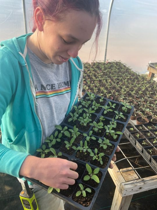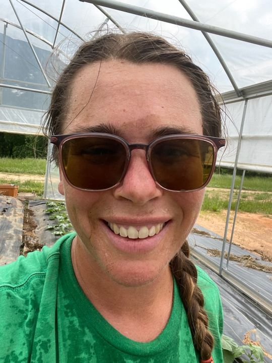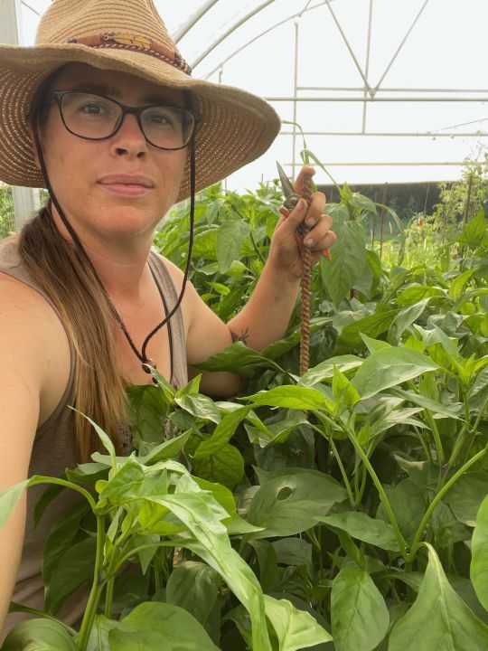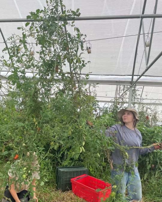 Anna is back! here she is pulling down tomatoes in the high tunnel