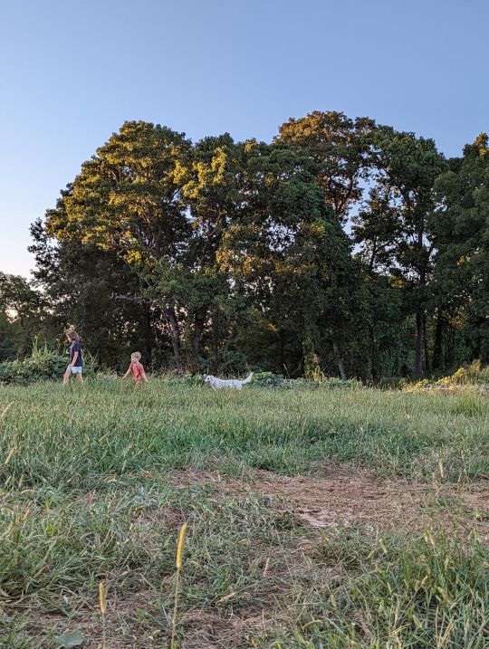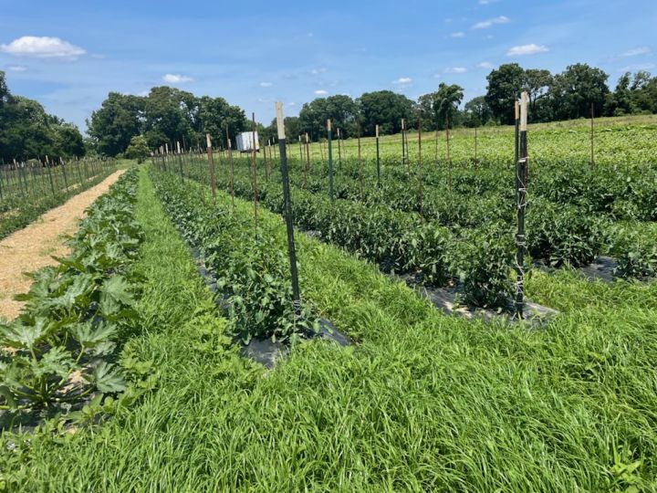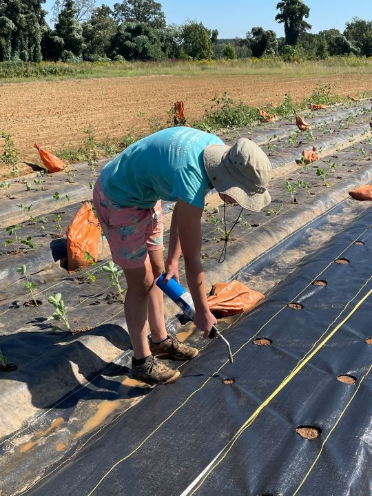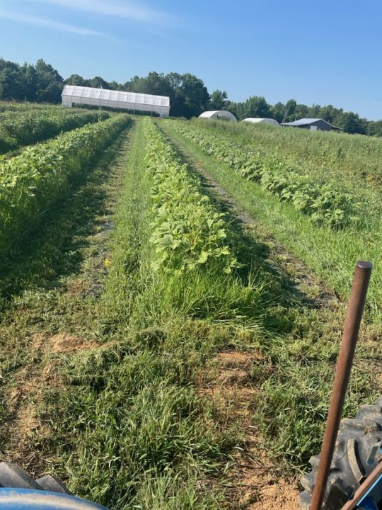 Melea and Skylar harvesting squash. There are alternating beds on summer squash and okra. Once Squash is done we can mow squash beds and have access to the okra