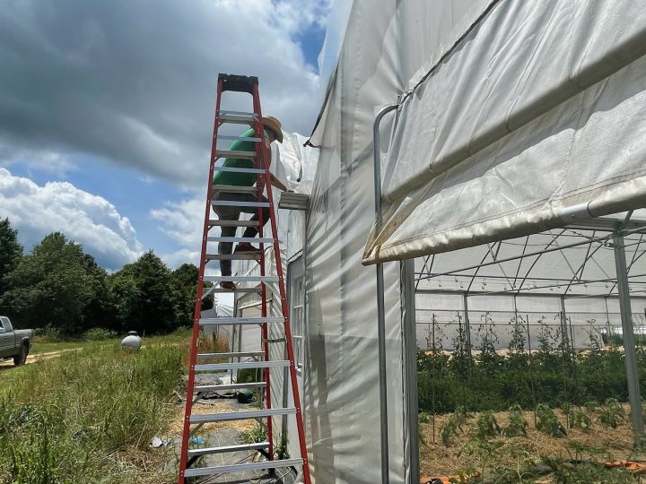 Josephine getting down off of the high tunnel after tying the shade cloth down