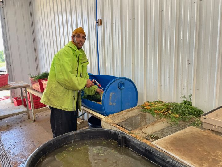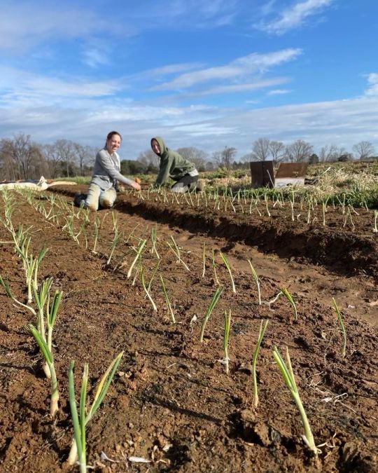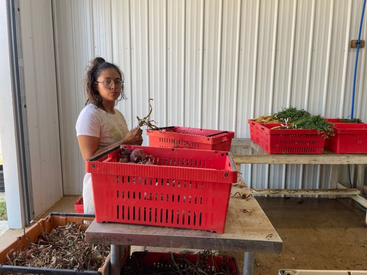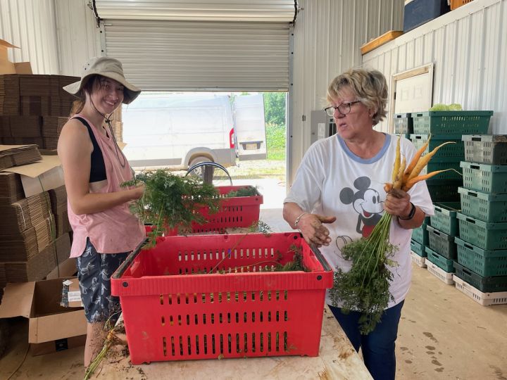 Skyler (L) and Connie (R) bunching carrots