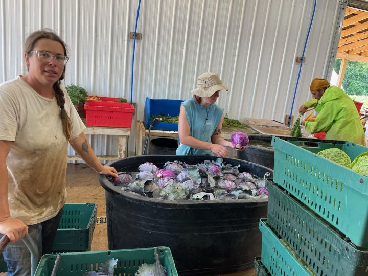Josephine (L) and Melea center washing the cabbage harvested