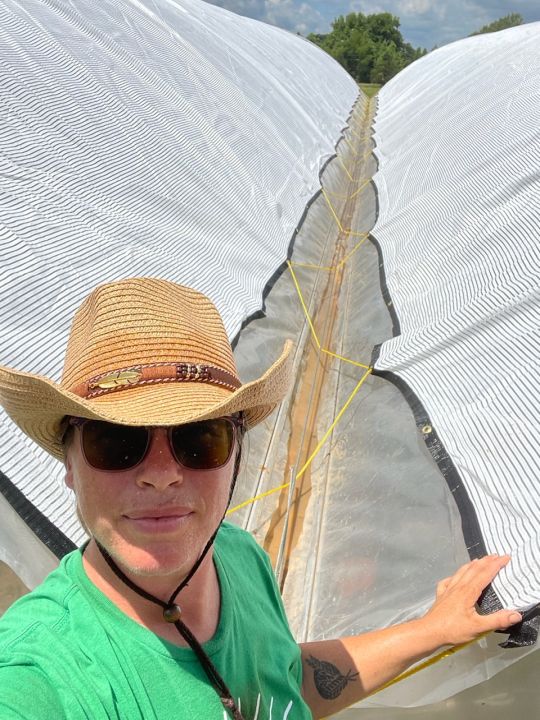 Josephine just finished lacing rope to secure the shade cloth on the double bay high tunnel