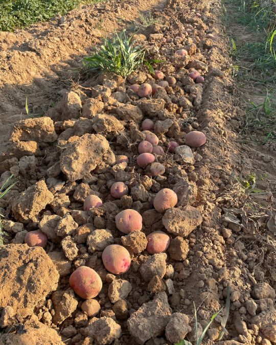 It’s dry! See how chunky the soil is coming out of our potato digger?