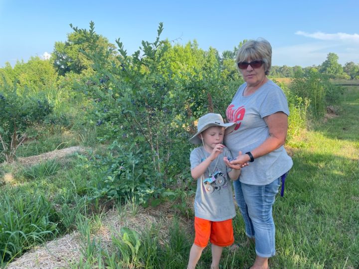 Connie and Cooper picking blueberries