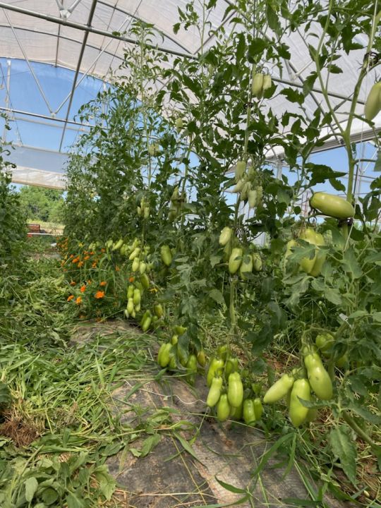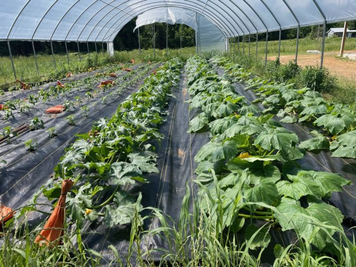 in the high tunnel peppers on the left and squashes on the right