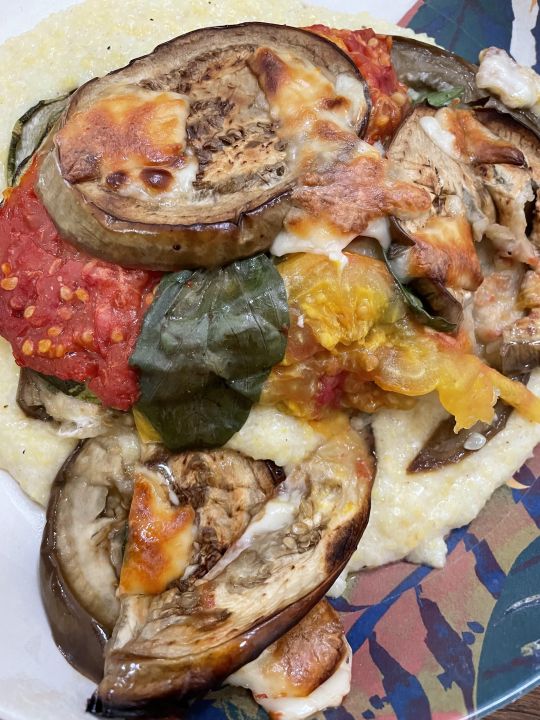 Roasted eggplant, tomato, basil and zucchini on polenta, yum!