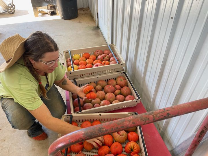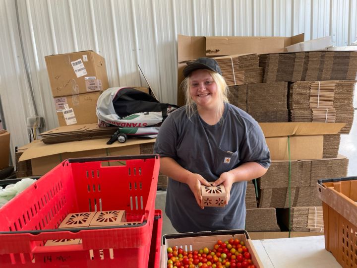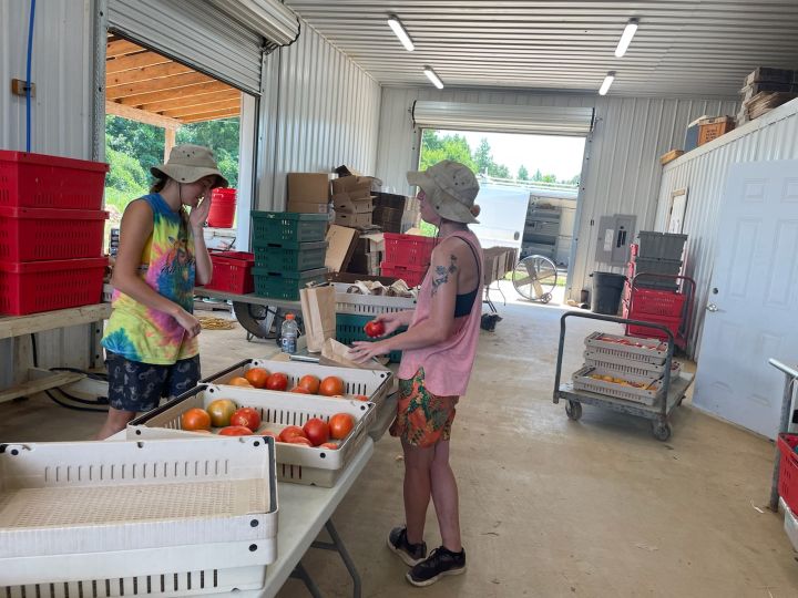 Skylar (L) and Melea (R) sorting and bagging tomatoes for CSA and market