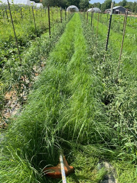 Living mulch, weed eating the teff grass we planted between tomato beds