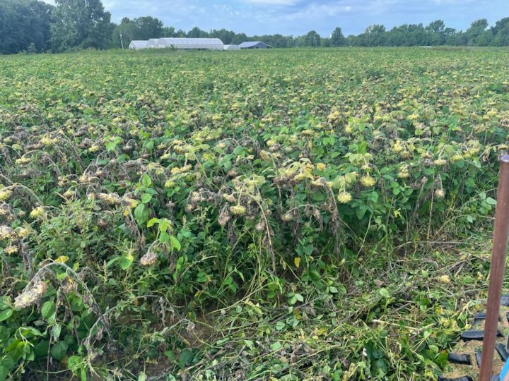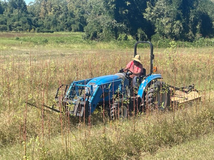 Mowing down the sunflower and cowpea cover crop