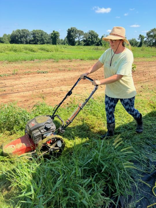 Josephine using our new trimmer/mower. It works great between the crops