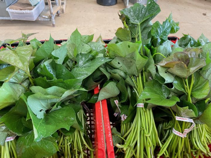 Bunched sweet potato greens bunched and headed to your table