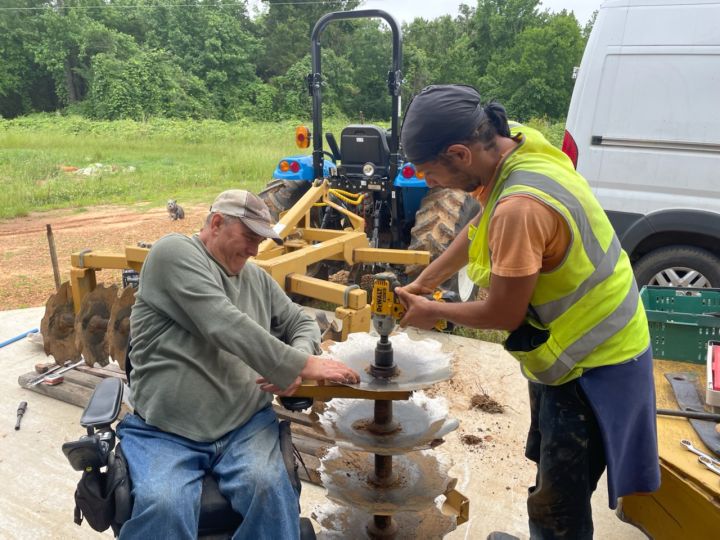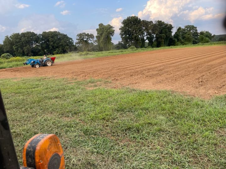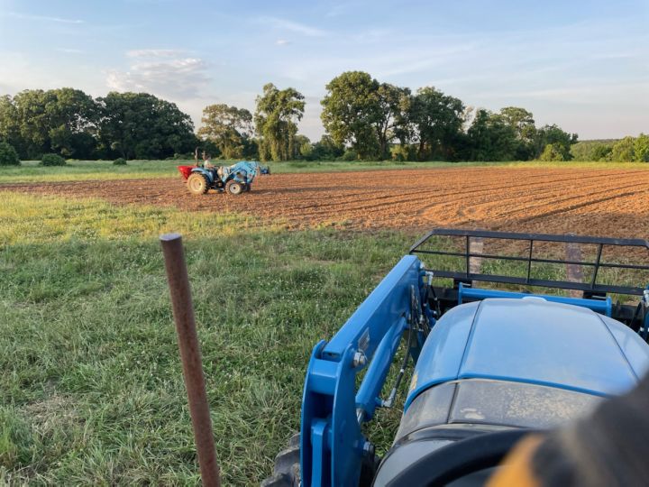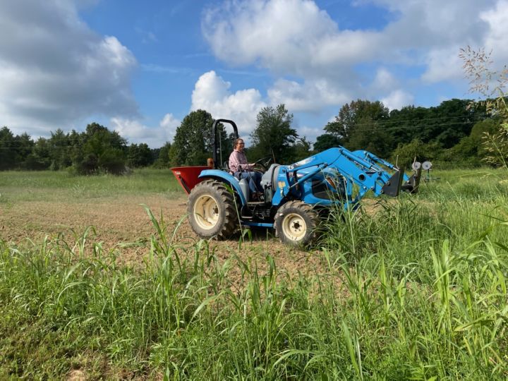 Josephine spreading cover crop seeds while Randy waits to lightly disc to cover the seeds