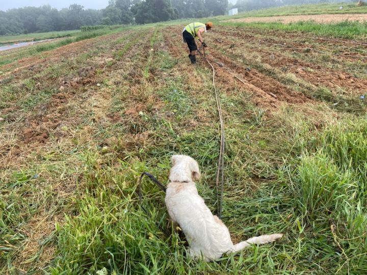 Robin and our pup Henry pulling drip tape