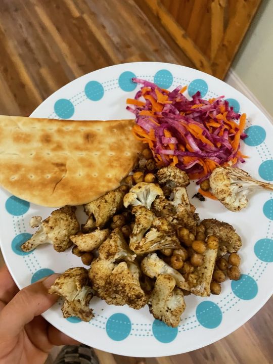 Fall farm meal, roasted cauliflower and chickpeas with a carrot and diakon salad